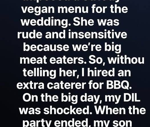 My son’s bride insisted on a strictly vegan menu for their wedding. She was deeply committed to her lifestyle, and while I respected her passion, she left no room for compromise. My family, longtime barbecue lovers, felt pushed aside. It wasn’t truly about the food—it was about feeling like our traditions had no place in the celebration. Wanting everyone to feel included, I quietly hired a small caterer to set up a separate barbecue station outside the main hall.